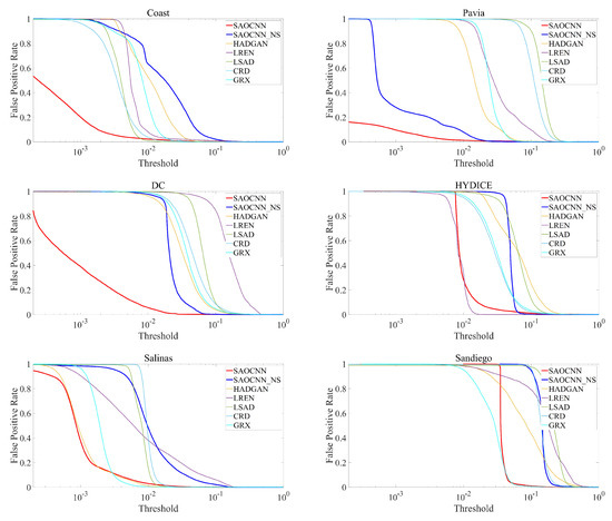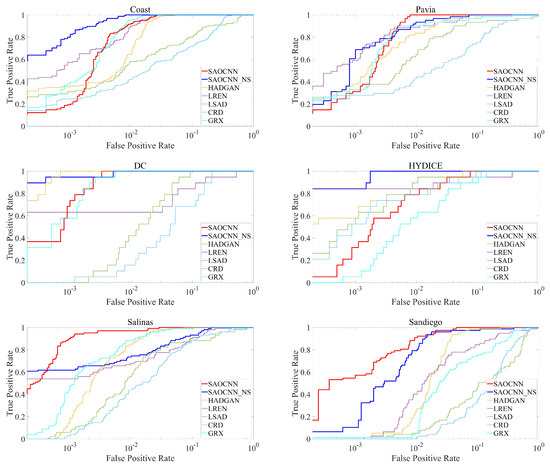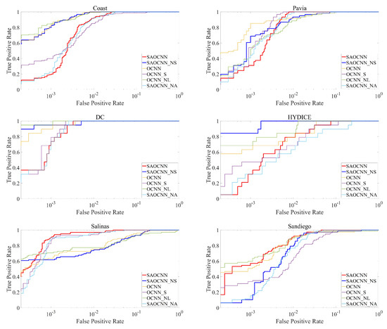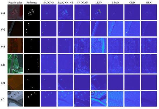 We used six real hyperspectral images and five methods for comparison, including traditional anomaly detection methods, such as GRX [19], CRD [39], and LSAD [69], and two recent anomaly detection methods based on deep learning, namely, HADGAN [52] and LREN [47], to verify the performance of our proposed hyperspectral anomaly detection algorithm. Because three-dimensional convolution can play different roles according to the anomaly size in images, we also introduced another version without the use of three-dimensional convolution for spatial feature extraction named SAOCNN_NS, where “NS” stands for “no spatial features”.