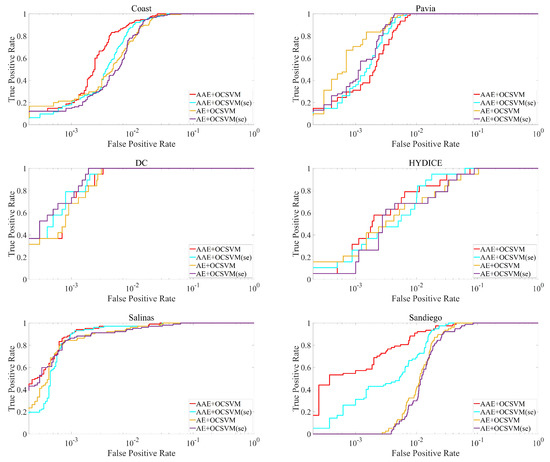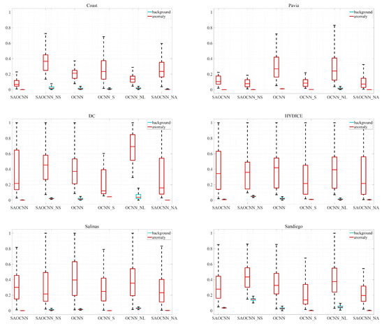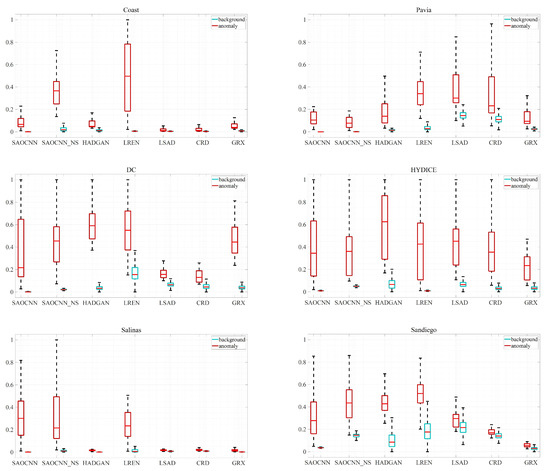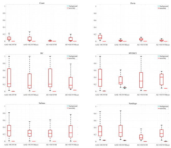 Although the values do not significantly increase, we noticed by comparing ROC curves in Figure 13 that the red curves are at the upper left of the yellow curves in most datasets, and the detection probability is much higher when the false alarm rate is about 0–. For the Pavia dataset, the AE performed better than AAE in ROC curves; however, we found that the red box of AAE is farther from the green box than that of AE from the box plot comparison in Figure 14. This suggests that the AAE highlighted anomalies better, although it is not obvious from the perspective.
