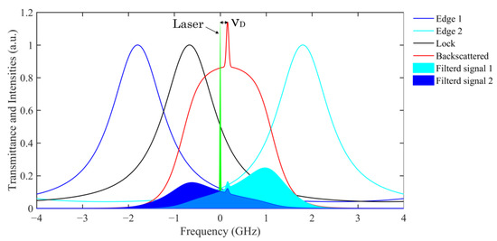 The subscripts 1, 2, or i indicate the edge channels, is the frequency, z is the height at which the echo was produced. T is calculated from the channel detection constant C and the convolution of the transmittance spectrum of edge channels, , and the atmospheric backscattering spectrum, . The channel transmittance curves, combined with their detection constants, can be calibrated by scanning the FPI. For stratospheric observation, the lidar echoes are mainly generated by Rayleigh–Brillouin scattering, which is described by the Tenti 6 model in the spectrum [18]. Significantly, the small amount of Mie scattering from aerosols that is depicted as a peak of the red line in Figure 1 should also be considered and will be discussed in Section 2.2.2 of this paper. The whole frequency shifts are obtained by interpolating the measured signal ratios into the calibrated frequency discrimination curve. Then the velocity of sight (VOS) can be derived: