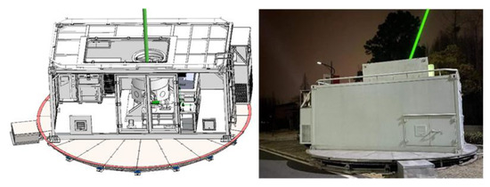 This Doppler Lidar system was designed for wind measurements from 7 km to 30 km, with height resolutions of 0.55 km (changeable). The whole system has been integrated into an equipment shelter with a size of 5 m × 2.7 m × 2.4 m, which is mounted on a rotary platform with a diameter of 6 m, as shown in Figure 2. In operation, the platform rotates with a speed of 2 degrees per second, and stays at 0, 90, 180, and 270 degrees, to measure the four VOSs. Considering the time for the rotary platform to return to zero, the rotation process takes about 4.5 min in a wind measurement period. For each VOS measurement, it takes 333 s for signal acquisition, in the case where 10,000 laser shots are accumulated, 15 s for laser warming, and 10 s for pre-measured frequency locking of the FPI. About 6 min are needed for each VOS measurement. So, the time consumption of the whole wind measurement period is 28.5 min.