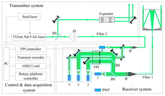 A computer is used to control the whole lidar system, including the laser, FPI, rotary platform, and data acquisition devices. A transient recorder (TR20-160, Licel GmbH, Berlin, Germany) with a 12-bit, 20 MHz AD (analog to digital) converter is employed to acquire the atmospheric backscattering signals of PMTs 1–3. This transient recorder can acquire AD and PC (photon counting) signals simultaneously. PMTs 4 and 5 measure signals from the transmitted laser pulses, which are ~10 ns width in the time domain. So, a high-speed acquisition card (ADQ12, Queentest Ltd., Hongkong, China) with a sampling rate of 1 GHz is used to acquire the pulse signals. The system parameters are summarized in Table 1.