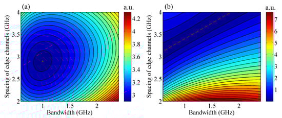 Simulated (a) random errors of VOS and (b) VOS errors caused by Mie signals with respect to different bandwidths and spacing of edge channels. A red dot or dotted line marks the optimized parameters.