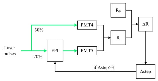 The procedure of frequency locking. R is the ratio of the two signals; R0 is the reference ratio; ΔR is the deviation of the signal ratio; Δstep is the converted FPI step.