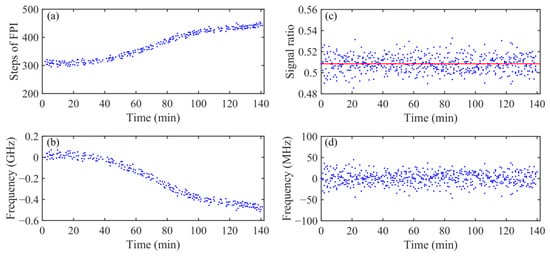 (a) The movement of FPI steps in a frequency locking process; (b) the equivalent frequency adjustment of FPI; (c) the locked signal ratios, accompanied by the reference ratio of 0.508 (red line); (d) the final frequency variation.