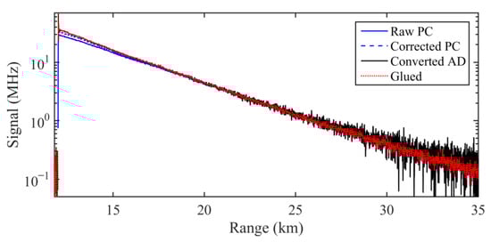 The lidar signals are acquired by a licel transient recorder in AD and PC modes simultaneously. The AD signals are reliable at lower altitudes but have poor SNR at higher altitudes, while the PC signals could reach higher detection altitudes but suffer saturation distortion due to the pulse pileup effect at lower heights [19,20,21]. Thus, the AD and PC profiles have been glued together to improve the dynamic range of detection.