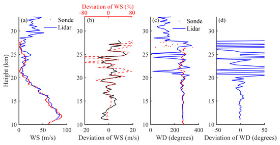 (a,c) Profiles of horizontal wind speed and direction measured by lidar (blue line) and radiosonde (red line). (b,d) Deviation between the two devices.