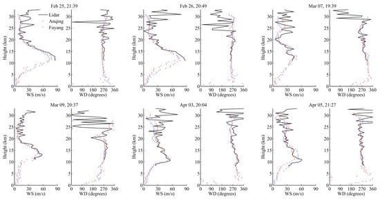 Comparison cases of wind speed and direction measured by lidar in Hefei (black lines) and radiosondes in Anqing (blue dots) and Fuyang (red dots).