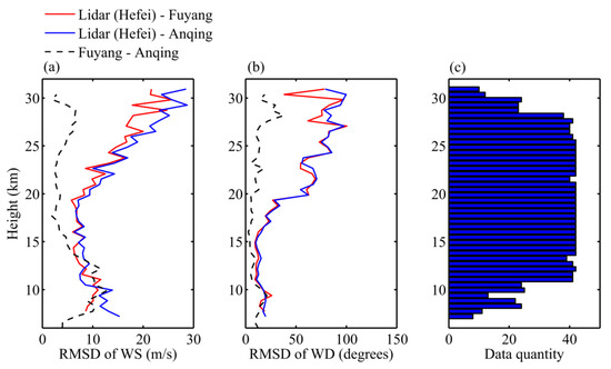 Due to the lack of local radiosonde data in Hefei, we used radiosonde data from Anqing (117.11°E, 30.53°N) and Fuyang (115.81°E, 32.91°N), which are, respectively, 154 km and 170 km from the lidar location, for comparison and subsequent statistics and analysis. The radiosonde data were obtained from the China Meteorological Data Service Centre (http://data.cma.cn (accessed on 30 December 2021)). From 25 February to 5 April, there were 42 lidar profiles that were close to the weather balloons’ lifting time at night and were employed for comparison with the radiosonde profiles from Anqing and Fuyang. All the data were normalized at a height resolution of 550 m. Figure 9 illustrates six cases of wind speed and direction comparisons. The wind fields of the two places were similar to each other above 5 km and generally consistent with the wind profiles measured by lidar in Hefei. Figure 10a shows the root mean square deviations (RMSD) between wind speed profiles as measured by lidar in Hefei and radiosondes in Anqing and Fuyang, respectively. The two lidar-sonde-RMSD profiles followed the same trend. For comparison, the RMSDs between the radiosonde profiles from Fuyang and Anqing (290 km apart from each other) are also shown with a black dashed line and reflect the regional difference in horizontal wind speed. The three RMSD profiles were comparable with values around 10 m/s from 7 to 14 km, decreased up to 20 km, and then increased up to 30 km. Due to the decrease in lidar SNR, the divergences between the lidar-sondes-RMSD profiles and the Anqing-Fuyang-RMSD profile gradually expanded with height. Similarly, Figure 10b presents the RMSD profiles of the wind directions. The lidar-sonde RMSDs of the wind directions are less than 20 degrees under 15 km, which is comparable to the Anqing–Fuyang RMSDs, and increased to more than 50 degrees above 20 km. Figure 10c shows the data quantities involved in the statistics at different heights. Since the original data points of the radiosonde are sparse and distributed irregularly, the normalized radiosonde profiles are occasionally missing data in some height bins, especially above 28 km. The bins under 11 km lack data because most of the lidar profiles were gated from 11 km.