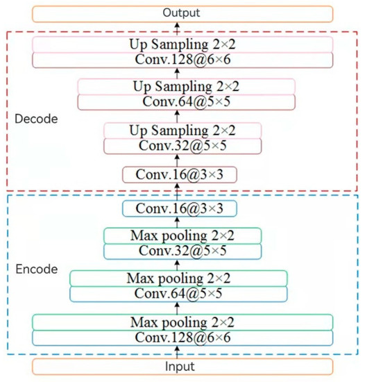 CAE is a kind of self-encoder, which uses convolution operation to realize feature extraction and the reconstruction of data (Figure 1). Generally speaking, the self-encoder only contains a full connection layer, while the CAE coding part contains a convolution layer and maximum pool layer, and the decoding part contains convolution layer and upper sampling layer (upsampling). Contrary to the effect of the pooling layer, upsampling is a process of increasing the data dimensions. There are two common methods of upper sampling: one is nearest-neighbor interpolation, and the other is linear interpolation. The results of the encoder convolution are upsampled in the model and then convolution-processed. Each maximum pool operation corresponds to an upper sampling operation, and the results after the upper sampling are convolutional, and the reconstructed image can be obtained.