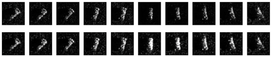 The features of the target in the SAR images are very sensitive to the incident direction during shooting. Therefore, although the MSTAR database provides the SAR images taken at the 360° azimuth angle, it is impossible to describe the phenomenon of image rotation after shooting. The image sizes of the different targets in the original data were inconsistent, but the targets were all located in the center of the image. The SAR image looks blurred and out of focus due to a lack of resolution and the noise created by the background and SAR data processing. Using the T72_BMP2_BTR70 dataset as an example, samples with a rotation transformation and a center offset were generated using the original images. Using the original image center as the reference point, the intercepted image block of size 80 × 80 was taken as the sample used in the experiment. To expand the dataset, the resulting training samples were manipulated by translation and rotation, as shown in Figure 4. The training sample set was expanded by 12 times for all the images of 30° in the range from 0° to 330°. The translation operation of the image pixels was also performed, shifting in the range of 9 by 9 pixels in the two-dimensional direction of the sample image with three pixels as the steps. This translation mode expands the training sample set 36 times. For feature extraction training using the previously introduced method, the training sample set is input into the CAE model for pretraining, encoding the input samples using the encoder, and used to reconstruct the input samples using the decoder. The above data amplification method was used in the pretraining, and 3000 samples of each class were randomly selected from the amplified dataset as the training samples. The parameters of the CAE model used in the experiment are set as shown in Figure 5. The encoder contains the four convolutional layers and the three maximum pooling layers, and the first three convolution layers are all connected behind them. The kernel function size of the four convolution layers is 6 × 6, 5 × 5, 5 × 5, and 3 × 3, and the number of kernel functions is successively 128, 64, 32, and 16. The decoder contains four convolutional layers, three upsampling layers, and the latter three convolution layers are all connected to an upsampling layer. The kernel function sizes of the four convolution layers are 3 × 3, 5 × 5, 5 × 5, and 6 × 6, and the number of kernel functions is successively 16, 32, 64, and 128. After CAE training, the reconstruction result of the target is as shown in Figure 6. The first line is the original target image, and the next line is the reconstructed image. The reconstruction loss is 0.12. It can be seen from the diagram that the CAE model after training can reconstruct the original image well and has good capability of feature extraction.