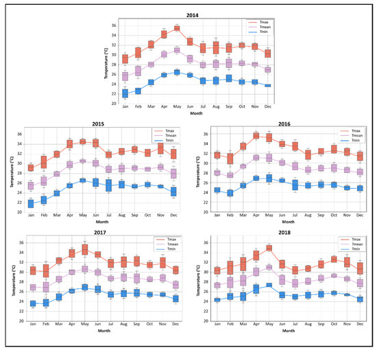 The LST and air temperature data show that beginning in March and continuing through April and May, there is an increasing tendency in the values, whereas values begin to decline in October and continue through January and February, which is similar to the observations in [28,65]. This trend is because March to May is the hot dry season in the Philippines while October to January is rainy and December to February is the cool dry season. In addition, it was found that there is a significant linear relationship between air temperature and land surface temperature based on daily data, while relative humidity shows a weak correlation with the LST data.