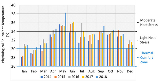 Thermal indices have been developed to approximate human thermal perception [55]. In particular, Physiological Equivalent Temperature (PET) is “the air temperature at which, in a typical indoor setting (without wind and solar radiation), the energy budget of the human body is balanced with the same core and skin temperature as under the complex outdoor conditions to be assessed” [57,58].