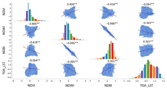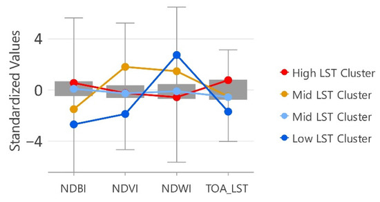 Land Use Land Cover (LULC) indicators such as NDVI, NDWI, and NDBI were very useful in understanding the morphological characteristics of Manila City, while their relationship with land surface temperature was also considered. Results of the multivariate analysis show that clusters can be generated based on combinations of these LULC indicators relative to land surface temperature. The clustering findings reveal that values with low NDWI, moderate NDVI, and high NDBI are grouped in the high LST cluster. Low NDWI corresponds to low water content, and high NDBI corresponds to urbanized zones; therefore, this is also predicted. Correlation between LULC indicators and LST shows the link between LST and LULC indicators with their respective slope of linear fit and frequency distribution chart. The data demonstrate a direct association between LST and NDBI at r = 0.361, meaning highly built-up regions have high reported temperatures. The multivariate analysis supports this finding. LST and NDVI (r = 0.064) and NDWI (r = 0.365) have indirect relationships. A Low Pearson correlation between LST and NDVI implies low temperatures for water bodies and vegetation, whereas mid values imply built-up areas. High water/moisture locations exhibit lower surface temperatures using LST and NDWI. Based on these data, it can be argued that NDWI is a better indication than NDVI for land surface temperature, which agrees with Alexander et al. [66]. NDBI is a good indication for LST, according to the data.