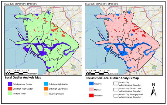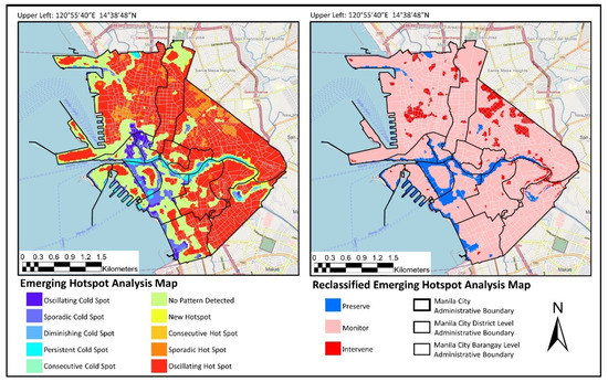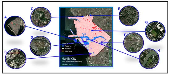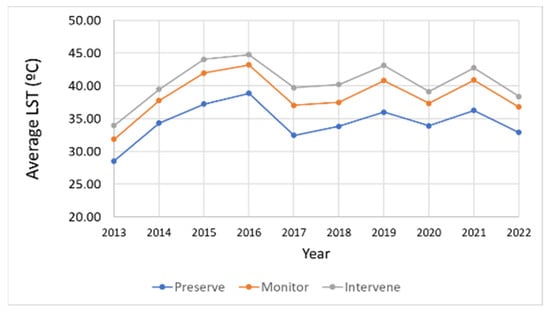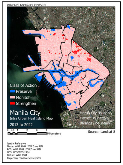 Summarizing the LST values per year per class of action reveals an average LST for “preserve”, “monitor” and “intervene” as 34.43 °C, 38.51 °C, and 40.56 °C, respectively. The result of this study clearly shows differences in temperature within Manila City. With these data, the average difference between cold and warm areas is about 6 °C, just as in the discussion in [20]. As the LST statistics are based on the highest LST readings for each site, it should be understood that the highest LST recorded differentiates 6 °C between specific urban areas. We avoided pixel-based comparison in the overall analysis to evaluate clusters of warm and cold regions appropriate to a city viewpoint and to make the analysis more significant.