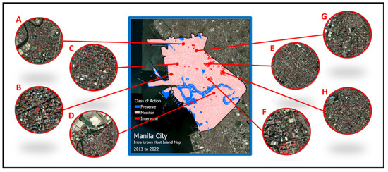 In the location assessment, the focus was given to areas to preserve and intervene. Understanding the morphology of “preserve” locations helps in the provision of mitigation strategies for the “intervene” locations. The results show that the highest temperatures are in areas with a concentration of urban settlement areas, buildings, and establishments while those with low temperatures are areas with enough vegetation and near bodies of water. Visual inspection revealed that most “intervene” areas are in the Sampaloc district and university belt. Such an area has a high concentration of universities and colleges while within it are settlement areas, establishments, and concrete roadways which are deemed contributory to the high surface temperature. Knowing this is crucial because aside from its residents, the population in this area swells due to students and employees coming from the nearby province during the daytime. Other intervention areas can be found in the Tondo district, which is home to urban poor communities, while there are also hotspots in the Paco district, which mainly points toward a commercial location. These regions are largely residential, with small streets and sidewalks and a concentration of settlements and dwelling sites. In the regions of concern, initiatives to create an urban soft scape employing trees and plants are limited and scarce. Roads and sidewalks are often constructed with asphalt and concrete, which may contribute to greater surface temperatures. There is also an identifiable commercial area, which seems to have asphalt or concrete companies, buildings, and parking spaces.