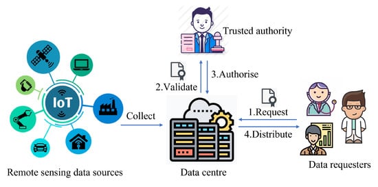 Our system model is depicted in Figure 1 with four entities: remote sensing data sources, data centre, data requesters, and a trusted authority (TA). The data centre acts as the management role to store and update the remote sensing data collected by different remote sensing data sources, including IoT devices, sensors, satellites, etc. Databases can be used to maintain plain remote sensing data by the data centre. When a data requester requires the specific data from the data centre, the data centre can delegate the trusted authority to validate the identity and access attributes of the data requester. If the trusted authority confirms the data requester is authorised to access the requested data, the data centre encrypts the requested data and distributes them to the data requester. After receiving the encrypted data, the data requester can use the key negotiated with the data centre to decrypt the encrypted data and check its integrity. Note that data requesters may use some mobile devices or IoT devices to receive the requested data in practice [].