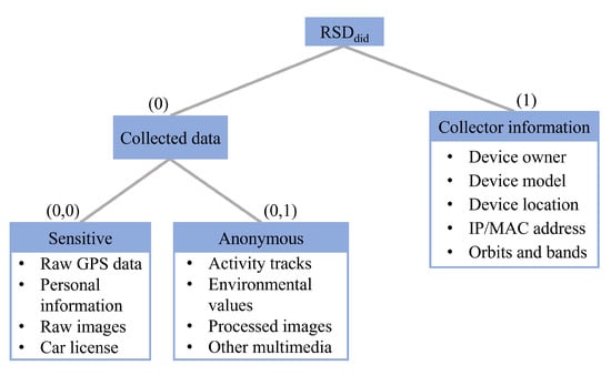 The attribute tree is used to control the access granularity (i.e., granular authorisation) in the content distribution. For each remote sensing data archive , it has an attribute tree defined by the data centre. Different may have different attribute trees. Here, an exemplar attribute tree corresponding to the remote sensing data archive is shown in Figure 2 (tree depth ). Because can involve different collected data and collector information, its exemplar attribute tree is constructed by four attribute tags in two layers. In the first layer of Figure 2, involves two attribute tags, “Collected data” and “Collector information”. Then, in the second layer, the collected data are divided into two parts (tags): “Sensitive” and “Anonymous”. As shown in Figure 2, each node in has an attribute tag, such as for “Collected data” and for “Anonymous”. Note that in the category of sensitive, personal information represents individuals’ faces and other characteristics (e.g., tattoos and clothes). Meanwhile, the sensitive information should be removed from all the data in the anonymous category.