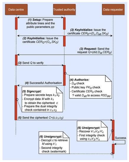 •Unsigncrypt (, C, , ): After receiving the encrypted data C, the data requester decrypts the encrypted data C with their private key and the data centre’s public key to retrieve the requested data M.