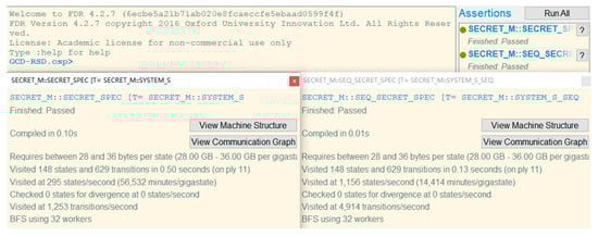 This section yields the formal verification result of the proposed scheme GCD-RSD by adopting the widely-used automated security protocol simulator, termed “Casper/FDR”, including the compiler Casper [] of the communicating sequential process (CSP) language [] and a CSP model checker Failures Divergences Refinement (FDR) []. CSP is a formal language to describe the interaction and states to model communications and security protocols.