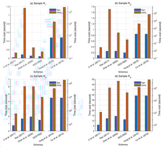 There are two reasons for us to select the ECCDH assumption as the foundation to construct our GCD-RSD scheme. The first one is that the ECCDH can achieve a higher security level with a shorter key size, which has been recommended by the National Institute of Standards and Technology (NIST), US []. The other reason is the higher computational efficiency and lower energy consumption of elliptic curve scalar multiplication in ECCDH than other cryptographic operations, such as bilinear pairing and modular exponentiation, which has been widely evaluated, especially for IoT devices [,,].
