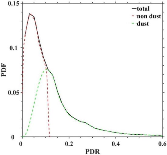 High PDR is an indicator of non-spherical particles [], thus, PDRs are widely used to identify dust aerosols [,,,]. Figure 1 shows the PDF of PDR for all aerosols. The PDF for all aerosols is a left-skewed distribution from 0.0–0.6 with a peak location at 0.03, which includes the hypothetical contributions from dust and non-dust aerosols as indicated with the black and green lines, respectively. Observations show that the PDR of the non-dust aerosol (e.g., marine, smoke, urban) is always 0.0–0.1 [,,,,,,]. Liu et al. [] showed that pure Africa dust aerosols have a mean PDR about 0.3 based on CALIPSO lidar measurements. Amiridis et al. [] showed the peak of PDR distribution for pure dust aerosols is 0.28 with a range mainly between 0.15 and 0.4, while the peak of polluted dust distribution is 0.09 with a range mainly between 0.05 and 0.25. Dust aerosols in polar regions are from local and long-range transportation sources [,]. Thus, Arctic dust aerosols have different levels of mixing states including pure dust, polluted dust and dusty marine, which results in a wide range of observed dust aerosol PDR. It is obvious that there are overlaps between PDR distributions of non-dust aerosols and dust aerosols. A threshold of 0.09 was selected to empirically identify dust aerosol according to the established literature in this work [,]. Uncertainties associated with the threshold selection are considered in the results.