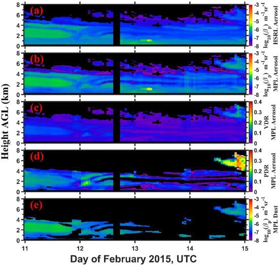 The time-height section of (a) HSRL particular backscatter coefficients, (b) MPL retrieved particular backscatter coefficients, (c) MPL total volume depolarization ratio (VDR), and (d) MPL particle depolarization ratio (PDR) from February 11 to 14, 2015 at the NSA site. (a–d) are for all aerosols. (e) MPL backscatter coefficient for dust aerosols that are identified using the PDR threshold 0.09.