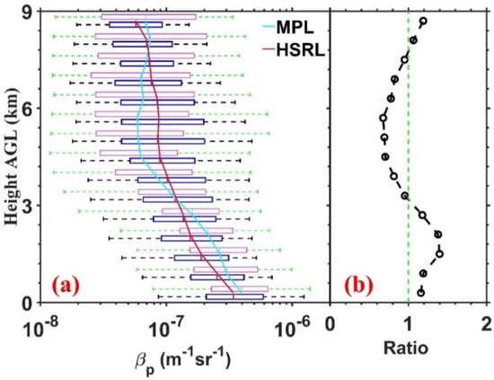 (a) The comparison of MPL (blue box) and HSRL (magenta box) backscatter coefficient vertical quartile distributions at the NSA site from January 2013 to September 2017. Box and whisker plots include the median, 25th and 75th percentiles (left and right of the boxes), and 5th and 95th percentiles (left and right of the whiskers). The red and cyan lines are for the medians of HSRL and MPL, respectively. (b) The ratio of MPL and HSRL backscatter medians.