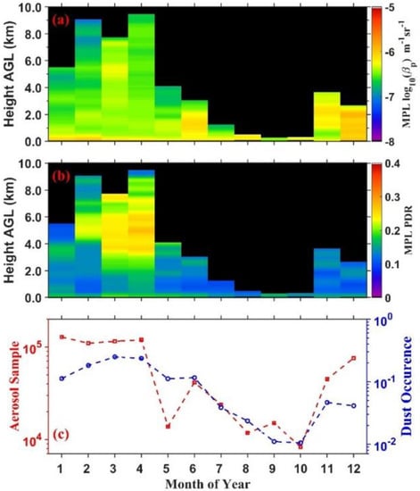 Figure 4 shows the seasonal cycle of MPL-derived dust aerosol backscatter coefficient and PDR profiles from January 2013 to September 2017 at the NSA site. This analysis is bases on cloud-free profiles. Dust aerosol is an important component of the Arctic haze. Dust aerosols occur in winter and spring in the entire troposphere, and in summer and autumn in the low (0–2 km) and middle (2–5 km) troposphere. These results are consistent with the seasonality of Arctic haze [,]. In the upper troposphere (5–10 km) dust aerosols occurring during the late winter and early spring (January–April) are likely associated with the long-range transportation of natural and anthropogenic aerosols from low-latitude areas including Eurasia, Siberia, North America, and Southeast Asia [,,,]. Further, Yang et al. [] showed that polar jets can carry dust aerosols from source regions to the Arctic with CALIOP measurement. There are few low-dust aerosol occurrences and small aerosol samples (red line of Figure 4c) during August–October. A high occurrence of thin and opaque clouds during summer and autumn is responsible for the low samples during this period [,]. Long-range dust transportation from middle latitudes is weak [], but wet deposition is obvious in this period []. Thus, dust aerosols during August–October are primarily from local and regional emissions [].
