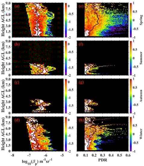 The vertical PDF distribution of seasonal particulate backscatter coefficients (a–d) and PDR for MPL (e–h) at the NSA site from January 2013 to September 2017. Rows from top to bottom are for spring (a,e), summer (b,f), autumn (c,g) and winter (d,h), separately. The seasonal average profiles (black lines) are plotted in each sub-figure. The color bar is the log scale of PDF distribution values of particular backscatter coefficients and PDR in each 150 m.