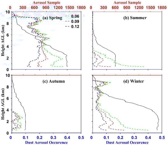Figure 6 shows the seasonal aerosol samples and dust occurrences. The number of the aerosol samples (black line in Figure 6) decreases with height for all seasons. The maximum amount of aerosol samples is in winter, and the minimum amount of aerosol samples is in autumn due to the seasonal cycle of clouds in the Arctic []. For the dust aerosol occurrences using PDR threshold 0.09 (red line in Figure 6), the maximum occurs in spring and the minimum occurs in autumn []. The maximum of occurrence profiles indicate that Arctic dust aerosols occur in three dust aerosol layers: 0–4 km, 4–8 km and 8–10 km during spring and winter, which is consistent with the example given in Figure 2. The dust aerosol occurrence is less than 0.1 in autumn and summer.