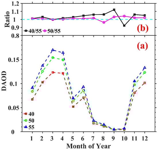 Here, the different lidar ratios are used to show the effect of lidar ratios on monthly DAOD retrievals. Figure 7a shows that the seasonality of DAODs with different lidar ratios is almost consistent except for the absolute values. To prove the small effect of lidar ratio on the monthly DAOD retrievals, the ratio of DAOD with different lidar ratios (black and magenta lines in Figure 7b) is calculated. The ratio is almost 5% except for the values in July–October (5–10%), which may result from small samples during these months.