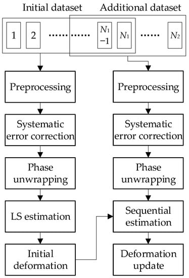 After the preprocessing, the conventional method performs the phase unwrapping first and then removes the systematic errors []. On the contrary, we first corrected the systematic error. In this paper, systematic errors refer to modelable errors, including the stratified atmosphere, radar phase center offset errors, etc. It should be noted that if the observation time interval is short enough, the surface deformation does not exceed the quarter wavelength of the radar. When the systematic error phase is corrected, there is no ambiguity in the residual phase (the deformation and random noise); hence phase unwrapping is not necessary for this circumstance. In addition, even if the time interval is long, the gradient of the wrapped phase after the systematic error correction would be reduced, which would improve the accuracy and efficiency of the subsequent unwrapping operation. Finally, the least squares (LS) method was used to obtain the deformation parameters of the initial dataset. In the additional dataset, it was only necessary to process the new data and then use the sequential estimator to combine the results of the initial dataset and update the deformation parameters. The systematic error correction method for the wrapped phase, the LS overall estimation, and the sequential estimation is introduced later.