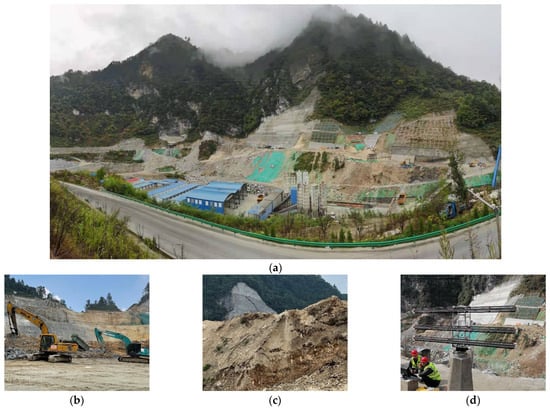 (a) Panorama of the downstream Zhen’an pumped-storage power station. (b) Excavation construction. (c) Exposed slope (d) GB-InSAR long-term observation point.