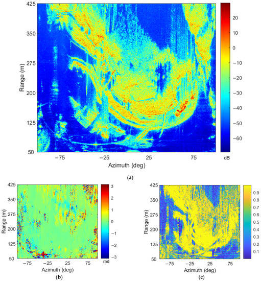 (a) Intensity image at 14:32 on 3 April 2021. (b) Interferogram from 14:32 to 14:37 on 3 April 2021. (c) Coherence coefficient image from 14:32 to 14:37 on 3 April 2021.