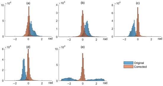 Statistical histogram of the wrapped phase before and after the systematic error correction of five typical interference pairs (a–e) in the experimental area.