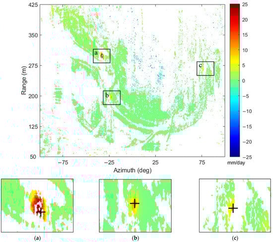 The average deformation rate from 3 April to 4 April 2021 obtained with the sequential estimation method and the three significant deformation regions (a–c).