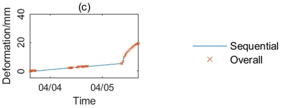 Finally, all SLC data were processed with a least squares overall estimation. Figure 9 shows that the two methods had a consistent deformation sequence in the deformation regions a, b, and c. The statistics on the cumulative deformation sequence of all points show that the deviation of the deformation value of 99.35% of the points is less than 0.1 mm, and the mean and standard deviation of the deviation are both better than 0.01 mm. The results obtained by LS overall estimation and the sequential estimation are highly consistent.