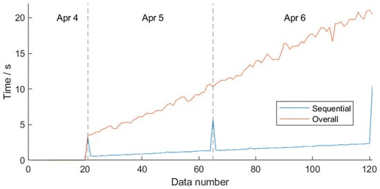 Figure 10 recorded the time consumption of the two methods separately, and the programs of the two methods were run independently on a workstation without interference. The data processing started from the 21st period, and the time consumption of the program operation was recorded for each additional period of data. Sequential program time consumption spikes were due to saving data when processing the last period of the day. Nonetheless, the sequential estimation consumed less time than the overall estimation after 21 periods. The average time growth rate of the sequential estimates was approximately 0.018 s/epoch, which is approximately one-tenth of that of the SBAS method (0.182 s/epoch).