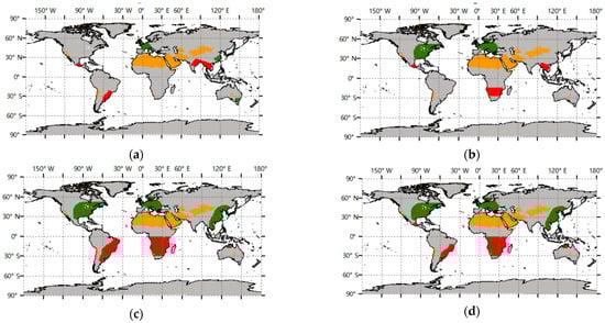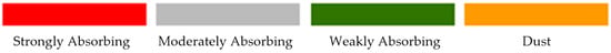 Similar to the extensible Bremen aerosol retrieval (XBAER) algorithm [23], aerosol types based on a priori assumptions were prescribed globally for a given region and season from an analysis of AERONET observations. Three fine-dominated types and a coarse-dominated dust type were used in ACFrC, with a 1° × 1° global grid, namely weakly, moderately, and strongly absorbing aerosol types and a dust type (Figure 1). The dust type was determined by the MODIS Land Cover product of 2019. Each of these four types were expressed by a bimodal lognormal function as a combination of fine and coarse models, with detailed micro-physical properties based on relevant work [58]. These properties of the assumed “dynamic aerosol” types were related to aerosol loading, with an AOT function implemented at 0.55 μm.