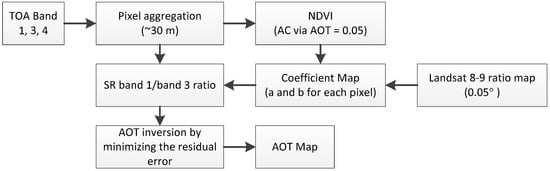 Figure 2 shows the scheme of the AOT inversion for the 4-band optical data. The key step was to determine the ratio between the red and blue bands for each pixel from the Landsat 8-9 ratio map file, which was derived from MODIS at 0.05°. To avoid the oversampling issue, the high-resolution TOA data were firstly aggregated into the medium scale (i.e., 20 to 30 m) and the band ratio for each aggregated pixel based on the linear function of NDVI was computed, expressed as