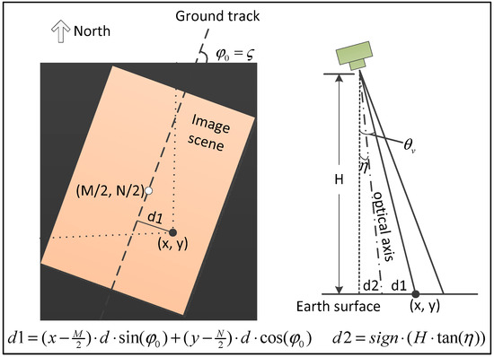 The SZ and SA angles were determined for each pixel via two steps: (1) these two solar angles were computed at a 1 km sampling distance over a spatial extent confined by four corner coordinates; (2) the solar angles for each pixel were assigned from the 1 km solar angle images via a bilinear resampling method. The state-of-the-art solar position algorithm (SPA) proposed by the National Renewable Energy Laboratory (NREL) was used here [59]. The VZ and VA were not considered as fixed angles, as in the case of images with narrow swaths (e.g., Landsat satellite images). Here, the VZ and VA angles were estimated roughly for each pixel according to the satellite orbit inclination (), off-nadir angle (), and altitude () (Figure 3).