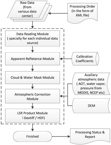 The entire processing chain is divided into modules for data reading, apparent reflectance, cloud and water masking, AC, and the LSR products, as shown in Figure 4. The tiling processing strategy is adopted to permit the input of extremely large data volumes. Necessary auxiliary data are also used, including radiometric calibration coefficients, atmospheric data (i.e., AOT, water vapor, and atmospheric pressure from MODIS products or NCEP reanalysis), and 1 km resolution ASTER DEM. The processing status is recorded once finished and a report is generated to trace any failure occurring in the entire processing chain. An order file in XML format is used to facilitate the processing of each image; this file contains all inputs, outputs, and parameter settings. The entire system is implemented in standard C++ language, which can maximize the platform portability, and part of the image processing module calls upon a universal remote sensing image processing library such as the Geospatial Data Abstraction Library (GDAL) [63].