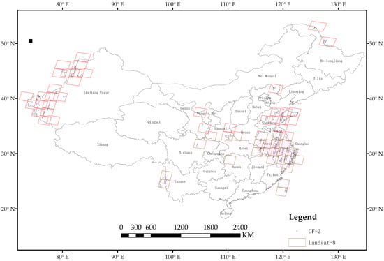 Map of the GF-2 scenes (purple dots) corresponding to the paired Landsat-8 scenes (red quadrangles) for cross-comparison over China and adjacent regions.
