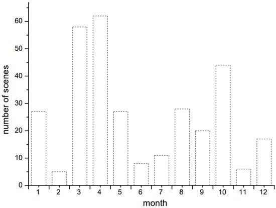 Regarding the product accuracy, most types of multi-source data have been tested by the system to date and reasonable results have been obtained. Two important performance indexes (i.e., the product accuracy and processing efficiency) related to the system were preliminarily evaluated based on a generation of many LSR products followed by evaluation. LSR products derived from GF-2 satellite data obtained over China (313 scenes in total) for the period of 2015 to 2018 were considered (Figure 5). The acquisition time of these data is listed in Figure 6, showing a minimum of six and maximum of sixty-two scenes. The selected 313 GF-2 scenes were representative of various types of surfaces, covering density forests, cities, crop lands, seashores, in-land waters, deserts, and arid lands over the mountainous and flat surfaces. Furthermore, the atmospheric conditions in these data varied quite differently from very clear to thin clouds and even heavy clouds. The accuracy of these products was evaluated through cross-comparison with the Landsat-8 OLI LSR products, considered as the reference data set. The paired data of GF-2 and Landsat-8 should be acquired on the same day, assuming no variation in the surface. The differences between these two datasets needs to be treated appropriately in terms of spatial resolution, spectral bandpass, and sun-view geometry. Due to the small field of view of these two satellites and approximate acquisition time (no more than 1 h), the BRDF effects were thus ignored in the cross-compassion partly because of their similarities in sun-view geometry and partly because of the possible uncertainties when applying the BRDF compensation.