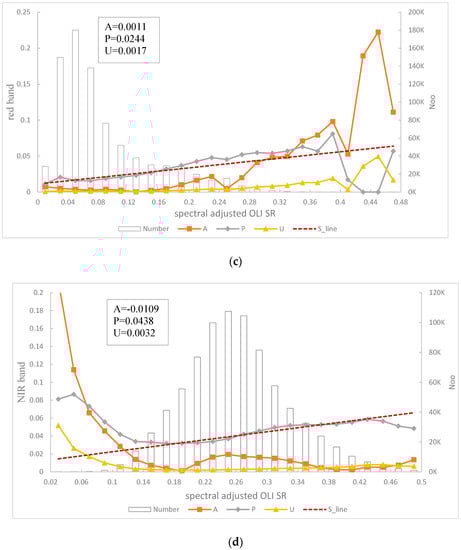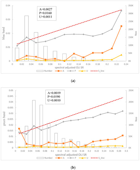 where , , and , respectively, represent the SR of the blue (0.49 μm), red (0.66 μm), and near infrared (0.83 μm) bands, and is the ratio between the blue band and the red band.