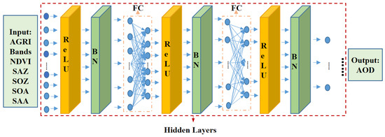 In the third step, to establish a machine learning model, the neural network is recommended for its excellent non-linear fitting ability [39]. The state-of-the-art practices of Fully Connected Neural Network (FCNN) training were used. The mini-batch gradient descent search method was used with a batch size of 200 epochs to ensure a stable and robust solution. Through selection of activation function selection, batch normalization, drop processing and full connection network parameters setting, the final model for FY-4A/AGRI AOD estimation was established with multiple iterations.