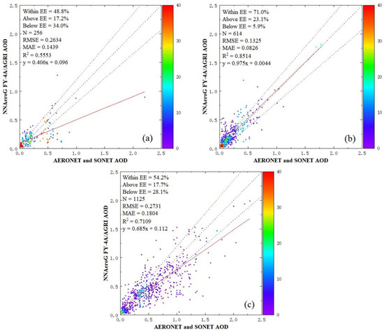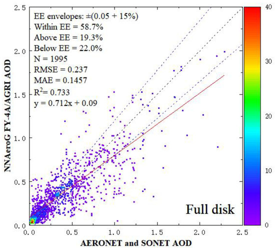 The NNAeroG was trained and its performance was validated by comparison with the data from the AERONET and SONET data set aside for validation. The full disk validation results are presented in Figure 4. Figure 4 shows that 58.7% of the AOD retrieved using the training data are within EE15, the RMSE, MAE and R2 are 0.237, 0.145 and 0.733, respectively. The above and below EE are similar. However, the slope is <1 and the figure shows that the larger AOD is underestimated by NNAeroG.