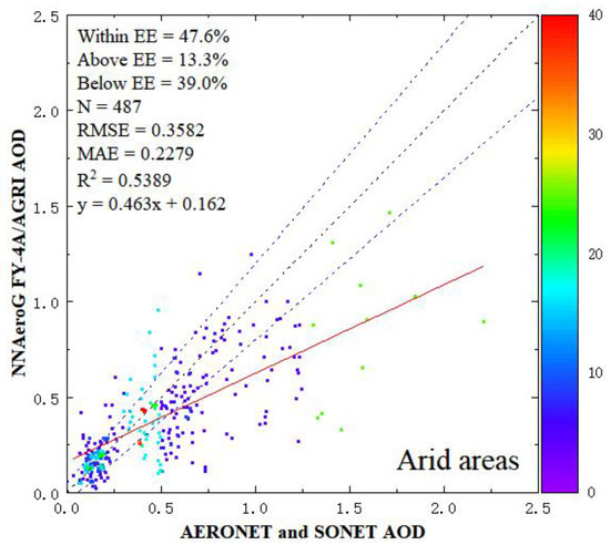 Figure 11 shows the validation of the AOD retrieved using FY-4A/AGRI data with the arid-augmented NNAeroG algorithm. Over the arid areas, the values of the statistical metrics RMSE, MAE, R2 and EE15 are 0.3068, 0.2062, 0.6498 and 49.3%, respectively. Although the AOD retrieval accuracy EE15 in arid areas was improved by 1.7% with arid sample augmentation, the EE15 of full disk retrieval accuracy was decreased by 1%. Only increasing samples through data expansion without obtaining more actual observations cannot achieve significant improvement.