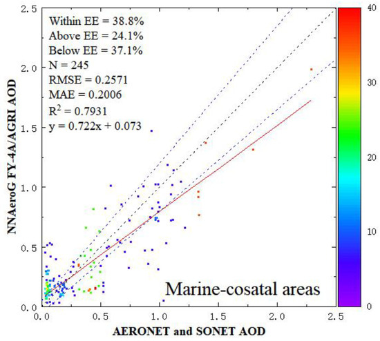 The RMSE, MAE, R2 and EE15 for the validation of the AOD retrieved over marine and coastal areas are 0.257, 0.201, 0.793 and 38.8%, respectively. The retrieval errors for AOD < 0.1 are generally high with values up to 0.5. For AOD > 0.3, the retrieved AOD is generally low. When the AOD of the ocean-atmosphere is less than 0.1, the satellite does not have enough aerosol optical signals to retrieve the AOD [10]. There are barely any pure marine samples (CE318 sites are located on the land or coast) for our training, therefore the training in marine areas is insufficient. The application of NNAeroG in marine and coastal areas needs much improvement and the method is currently not suitable enough for AOD production. However, this does not mean other algorithms also poorly retrieve AOD of FY-4A/AGRI over the ocean. A Coastal Water AOD retrieval algorithm such as that which was applied on MODIS would achieve high accuracy [47].