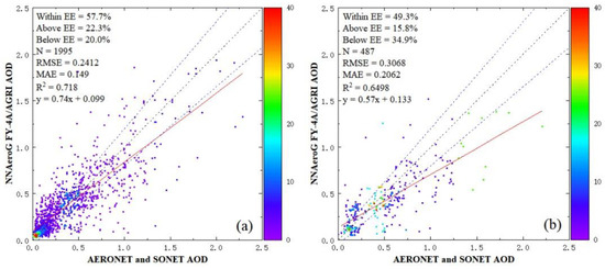 The surface reflectance of arid areas is relatively high and distinguishing atmospheric aerosol contributions to the TOA reflectance is difficult [45]. The comparison of FY-4A/AGRI/NNAeroG AOD retrieval results over arid areas with reference AERONET and SONET data is shown in Figure 6. The values of the statistical metrics RMSE, MAE, R2 and EE15 are 0.358, 0.228, 0.539 and 47.6%, respectively. For AOD < 0.3, the retrieval results are in good agreement with the AERONET and SONET data. However, for AOD > 0.5, the majority of the AGRI retrieval results are underestimated. The retrieval of arid areas needs further improvement.